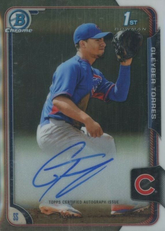 The Gleyber Torres 2015 Bowman Chrome #BCAP-GT Prospect Auto (1st) card in Raw condition has moved down -$0.50 (-1.5%) in the last 30 days and was last sold for $32.50 .