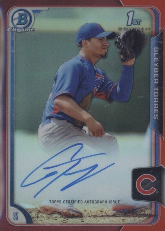 This card is 1 of 9 Gleyber Torres' card variations in the 2015 Bowman Chrome set being tracked by Sports Card Investor, including Prospect Auto (1st), Prospect Auto - Refractor /499 (1st), Prospect Auto - Purple Refractor /250 (1st), Prospect Auto - Blue Refractor /150 (1st), and Prospect Auto - Green Refractor /99 (1st).