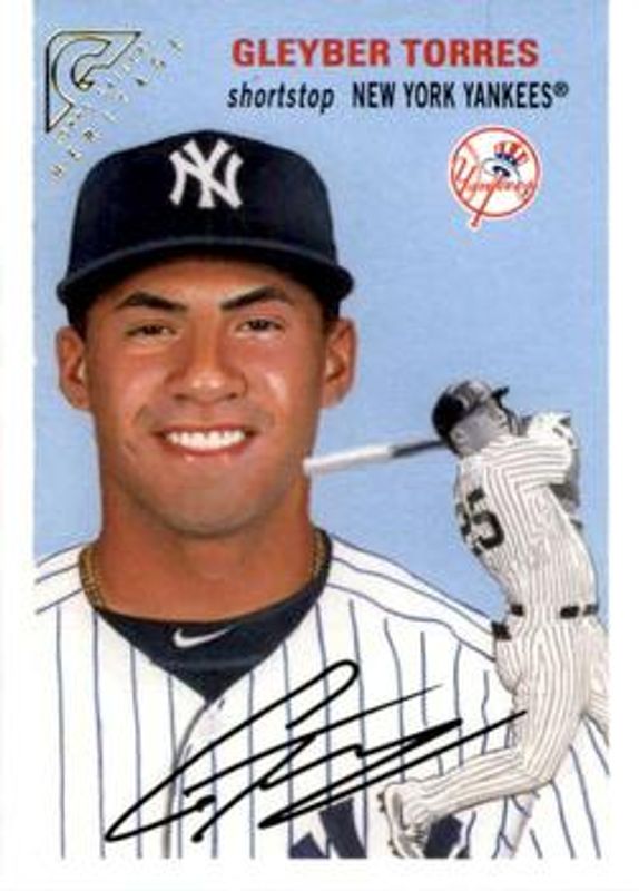 The Gleyber Torres 2020 Topps Gallery #HT-21 Heritage card is 1 of 29 Gleyber Torres' card variations in the 2020 Topps Gallery set being tracked by Sports Card Investor, including Base, Artist's Proofs, Rainbow Foil, Wood, and Private Issue /250.