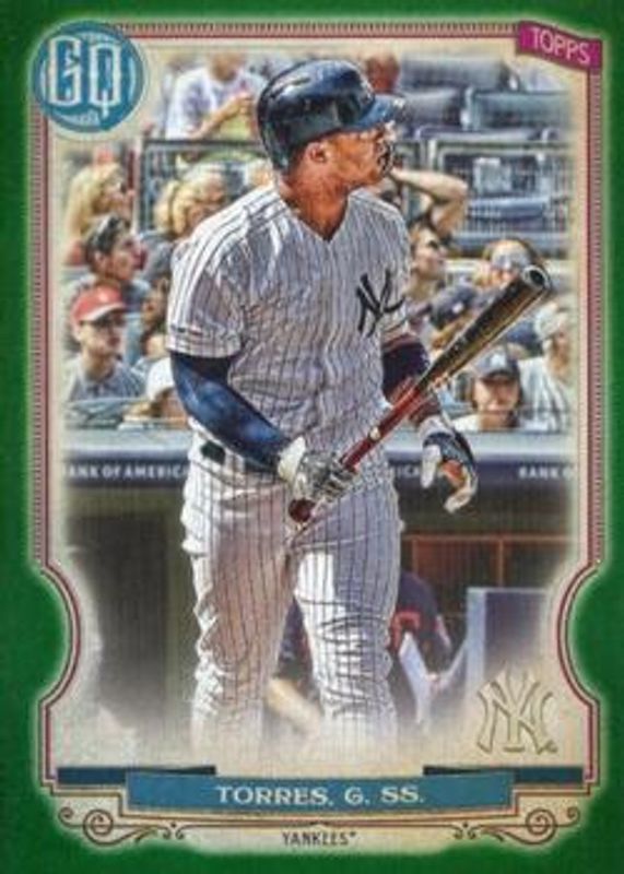 The Gleyber Torres 2020 Topps Gypsy Queen #100 Green card is 1 of 37 Gleyber Torres' card variations in the 2020 Topps Gypsy Queen set being tracked by Sports Card Investor, including Base, Bazooka Back, GQ Logo Swap, Missing Nameplate, and Silver.