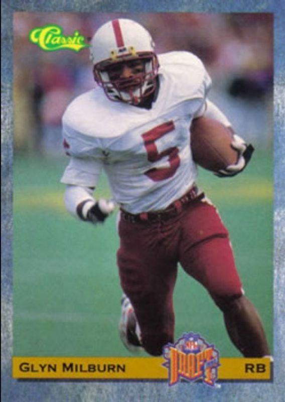The Glyn Milburn 1993 Classic #29 Base Rookie card is 1 of 3 Glyn Milburn's card variations in the 1993 Classic set being tracked by Sports Card Investor, including Gold, and Draft Stars.
