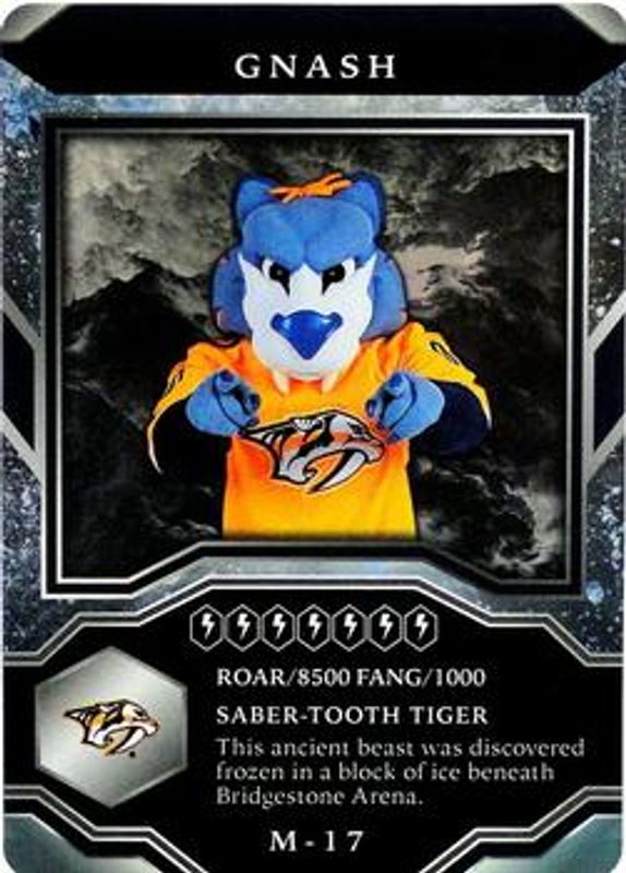 The Gnash 2021 Upper Deck MVP #M-17 Mascots Gaming card is 1 of 6 Gnash's card variations in the 2021 Upper Deck MVP set being tracked by Sports Card Investor, including Mascots Gaming Sparkle, Mascot Gaming - Printing Plates Black /1, Mascot Gaming - Printing Plates Cyan /1, Mascot Gaming - Printing Plates Magenta /1, and Mascot Gaming - Printing Plates Yellow /1.