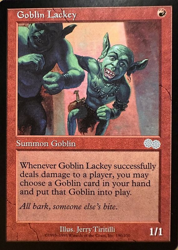 The Goblin Lackey 1998 Urza's Saga #190 Base card in Raw TCG (Lightly Played) condition has moved down -$6.50 (-32.5%) in the last 30 days and was last sold for $13.50 .