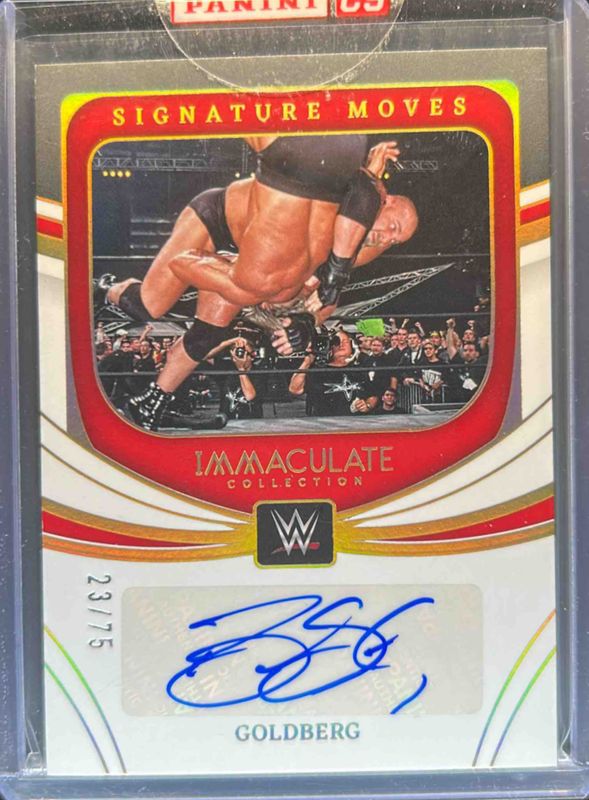 The Goldberg 2022 Immaculate WWE #SM-GBG Immaculate Signatures Moves /49 card is 1 of 18 Goldberg's card variations in the 2022 Immaculate WWE set being tracked by Sports Card Investor, including Base /99, Red /25, Gold /10, Green /5, and Platinum /1.