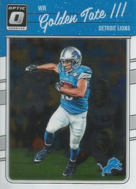 The Golden Tate 2016 Optic #35 Base card is 1 of 11 Golden Tate's card variations in the 2016 Optic set being tracked by Sports Card Investor, including Holo, Aqua /299, Orange /199, Blue /149, and Red /99.