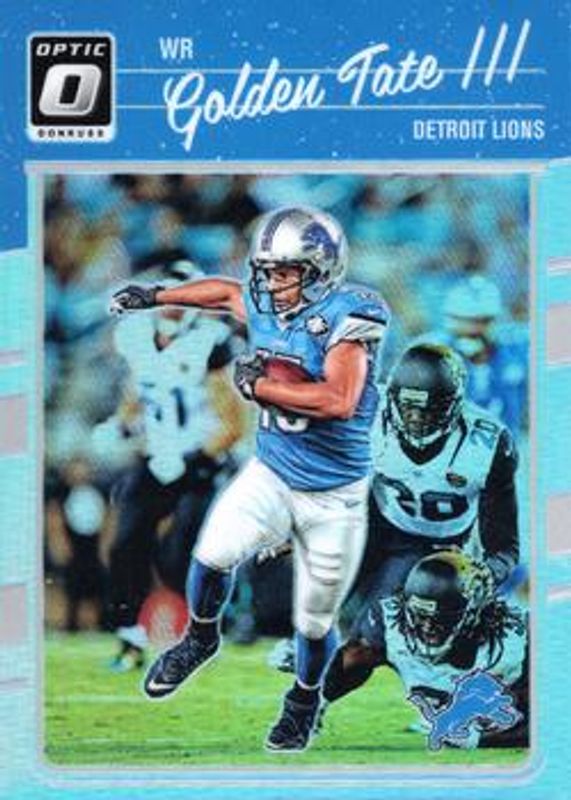 The Golden Tate 2016 Optic #35 Holo card is 1 of 11 Golden Tate's card variations in the 2016 Optic set being tracked by Sports Card Investor, including Base, Aqua /299, Orange /199, Blue /149, and Red /99.