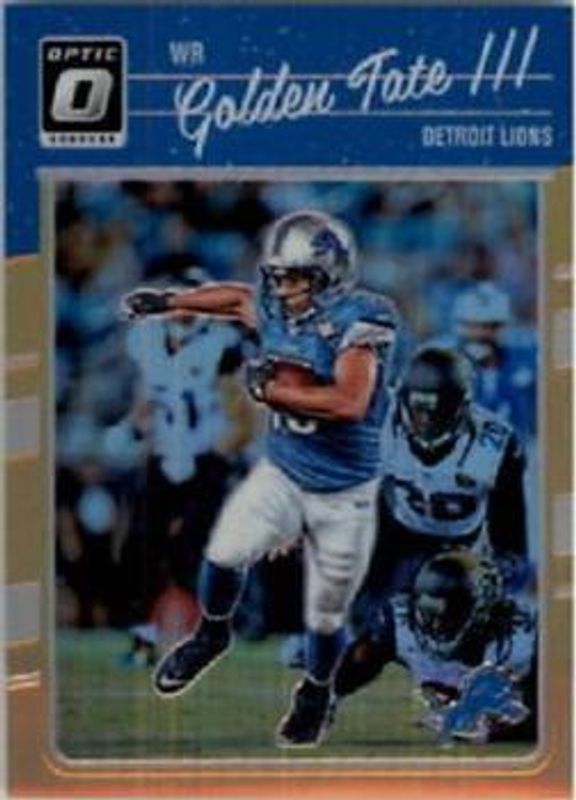 The Golden Tate 2016 Optic #35 Orange /199 card is 1 of 11 Golden Tate's card variations in the 2016 Optic set being tracked by Sports Card Investor, including Base, Holo, Aqua /299, Blue /149, and Red /99.