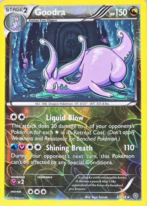The Goodra 2015 XY: Ancient Origins #60/98 Reverse Holo card in Raw TCG (Near Mint) condition has not changed in price in the last 30 days and was last sold for $2.49 .