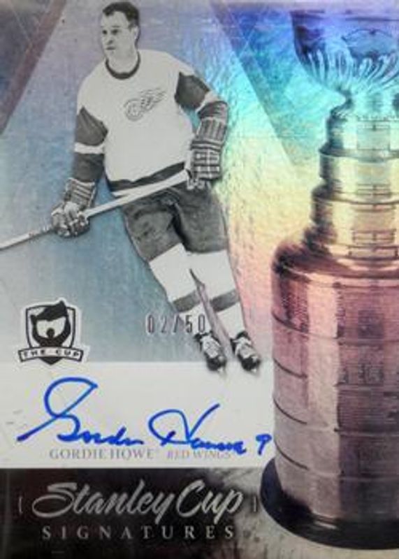 The Gordie Howe 2010 Upper Deck The Cup #SC-GH Stanley Cup Signatures /50 card is 1 of 14 Gordie Howe's card variations in the 2010 Upper Deck The Cup set being tracked by Sports Card Investor, including Base /199, Artist Proof Stanley Cup Signatures, Gold /25, Black /1, and Printing Plates Black /1.