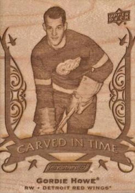 The Gordie Howe 2019 Upper Deck Engrained #CT-1 Carved in Time card is 1 of 11 Gordie Howe's card variations in the 2019 Upper Deck Engrained set being tracked by Sports Card Investor, including Base /299, Ebony /49, Mahogany /10, Rosewood /1, and Carved in Time Signatures.