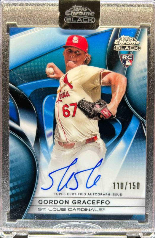 The Gordon Graceffo 2025 Topps Chrome Black #CBA-GG Autographs - Blue Refractor /150 Rookie card is 1 of 11 Gordon Graceffo's card variations in the 2025 Topps Chrome Black set being tracked by Sports Card Investor, including Autographs, Autographs - Refractor /199, Autographs - Green Refractor /99, Autographs - Gold Mini-Diamond Refractor /50, and Autographs - Gold Refractor /50.