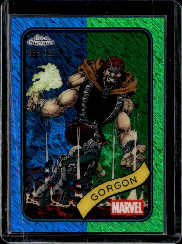 The Gorgon 2025 Topps Chrome #195 Blue & Green Shimmer Refractor /199 card is 1 of 23 Gorgon's card variations in the 2025 Topps Chrome set being tracked by Sports Card Investor, including Base, Refractor, Yellow Lava Refractor, Spider Web Refractor /399, and Blue Refractor /299.