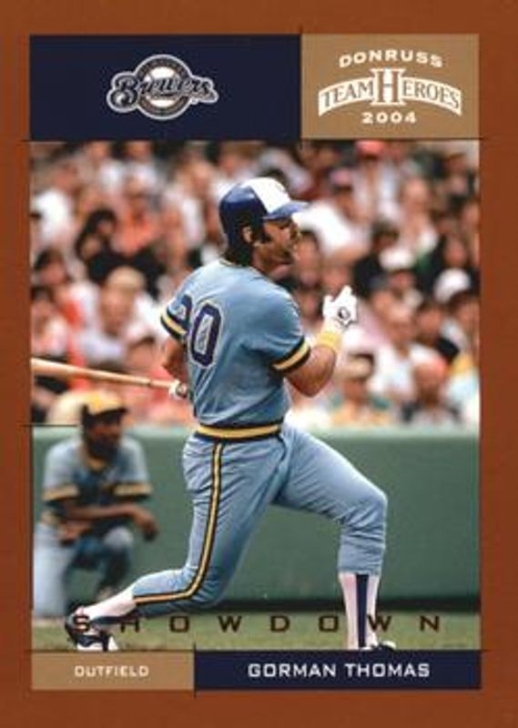 The Gorman Thomas 2004 Donruss Team Heroes #233 Showdown - Bronze /150 card is 1 of 5 Gorman Thomas' card variations in the 2004 Donruss Team Heroes set being tracked by Sports Card Investor, including Base, Showdown - Silver /50, Showdown - Gold /10, and Autographs /10.