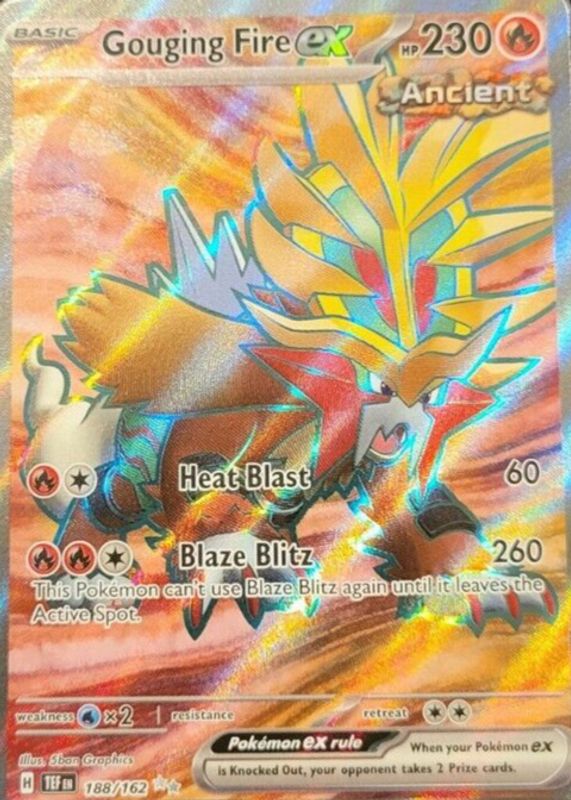 The Gouging Fire ex 2024 Scarlet & Violet: Temporal Forces #188/162 Ultra Rare card in Raw TCG (Near Mint) condition has moved down -$0.18 (-7.0%) in the last 30 days and was last sold for $2.40 .