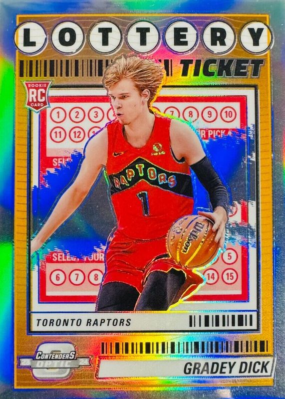 The Gradey Dick 2023 Contenders Optic #5 Lottery Ticket Rookie card in Raw condition has not changed in price in the last 30 days and was last sold for $1.00 .