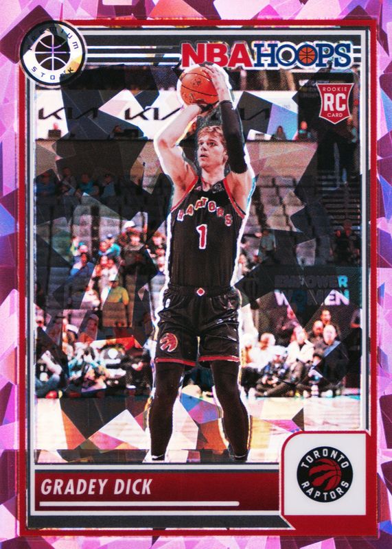 This card is 1 of 58 Gradey Dick's card variations in the 2023 Hoops Premium Stock set being tracked by Sports Card Investor, including Base, Disco, Ice, Multi Wave, and Premium.