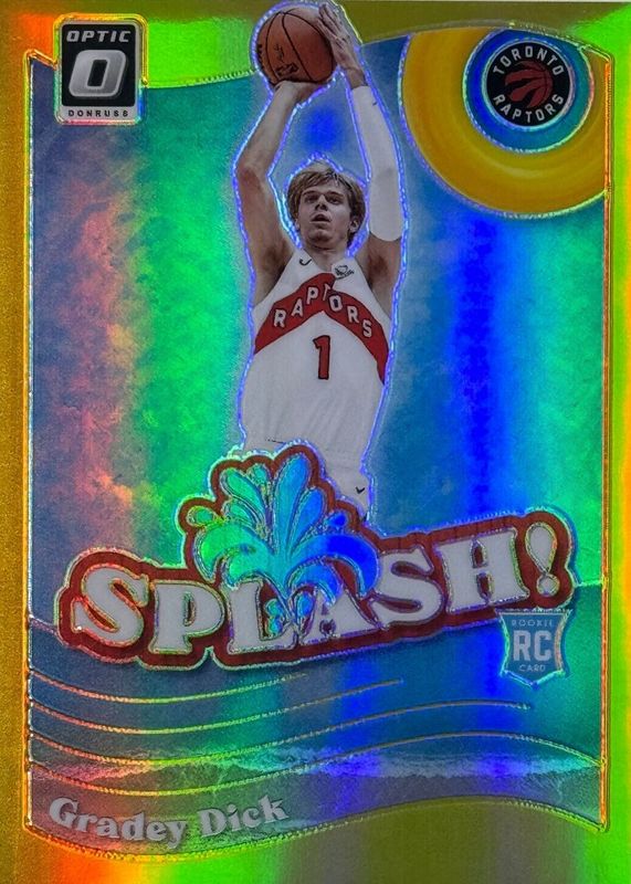 The Gradey Dick 2023 Optic #9 Splash! - Gold /10 Rookie card in Raw condition has not changed in price in the last 30 days and was last sold for $230.00 .