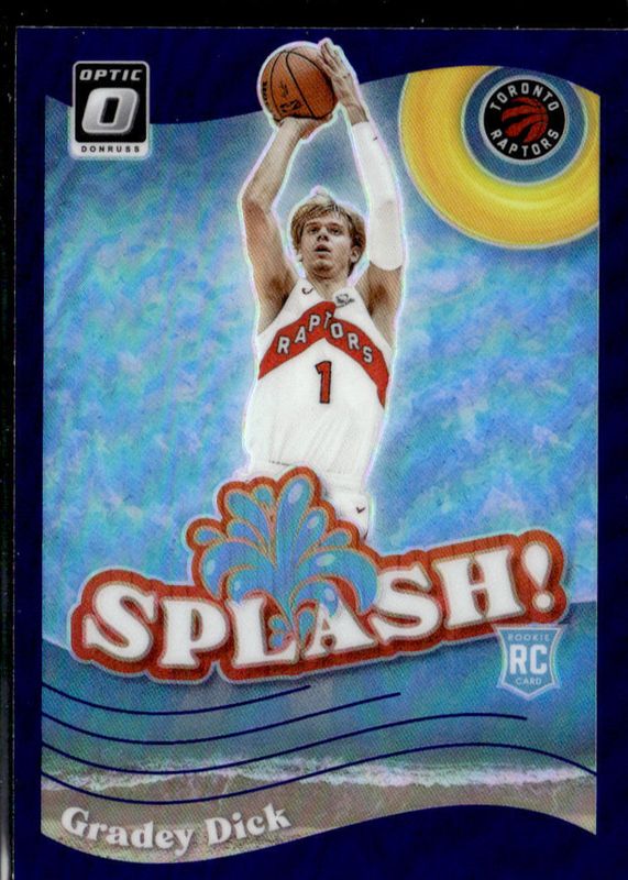 The Gradey Dick 2023 Optic #9 Splash! - Purple Rookie card in Raw condition has moved up $3.26 (+329%) in the last 30 days and was last sold for $4.25 .