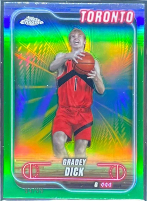 The Gradey Dick 2024 Topps Chrome #92 Green Refractor /99 card is 1 of 35 Gradey Dick's card variations in the 2024 Topps Chrome set being tracked by Sports Card Investor, including Base, Blue Basketball Refractor, Magenta Refractor, Negative Refractor, and Pink Basketball Refractor.