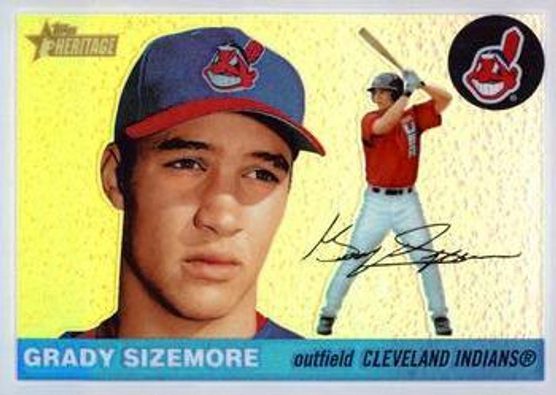 The Grady Sizemore 2004 Topps Heritage #447 Base card is 1 of 4 Grady Sizemore's card variations in the 2004 Topps Heritage set being tracked by Sports Card Investor, including Chrome /1955, Chrome Refractor /555, and Chrome Black Refractor /55.