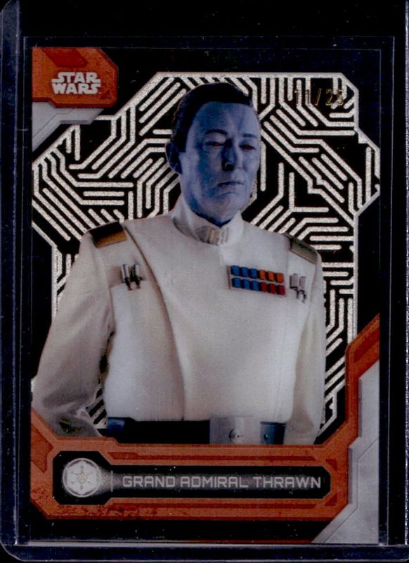 The Grand Admiral Thrawn 2024 Topps Chrome Black Star Wars #100 Orange Refractor /25 card is 1 of 25 Grand Admiral Thrawn's card variations in the 2024 Topps Chrome Black Star Wars set being tracked by Sports Card Investor, including Base, Rainbow Refractor /199, Blue Red Lava Refractor /99, Yellow Lazer Refractor /75, and Gold Refractor /50.