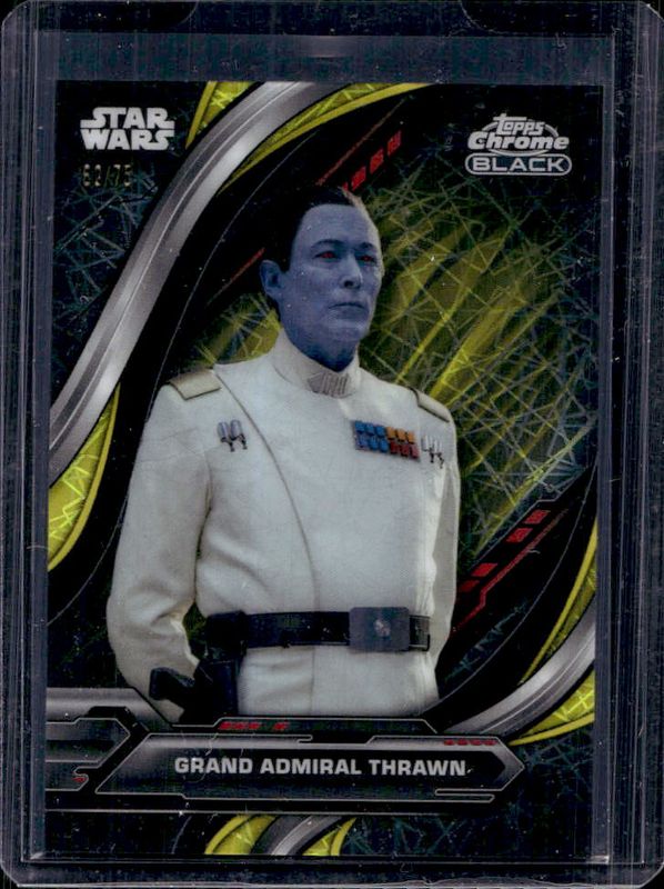 The Grand Admiral Thrawn 2024 Topps Chrome Black Star Wars #100 Yellow Lazer Refractor /75 card is 1 of 25 Grand Admiral Thrawn's card variations in the 2024 Topps Chrome Black Star Wars set being tracked by Sports Card Investor, including Base, Rainbow Refractor /199, Blue Red Lava Refractor /99, Gold Refractor /50, and Orange Refractor /25.