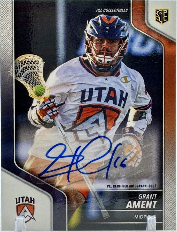The Grant Ament 2024 Premier Lacrosse League #38 Autographs card is 1 of 19 Grant Ament's card variations in the 2024 Premier Lacrosse League set being tracked by Sports Card Investor, including Base, Blue /77, Yellow /49, Black /25, and Red /10.