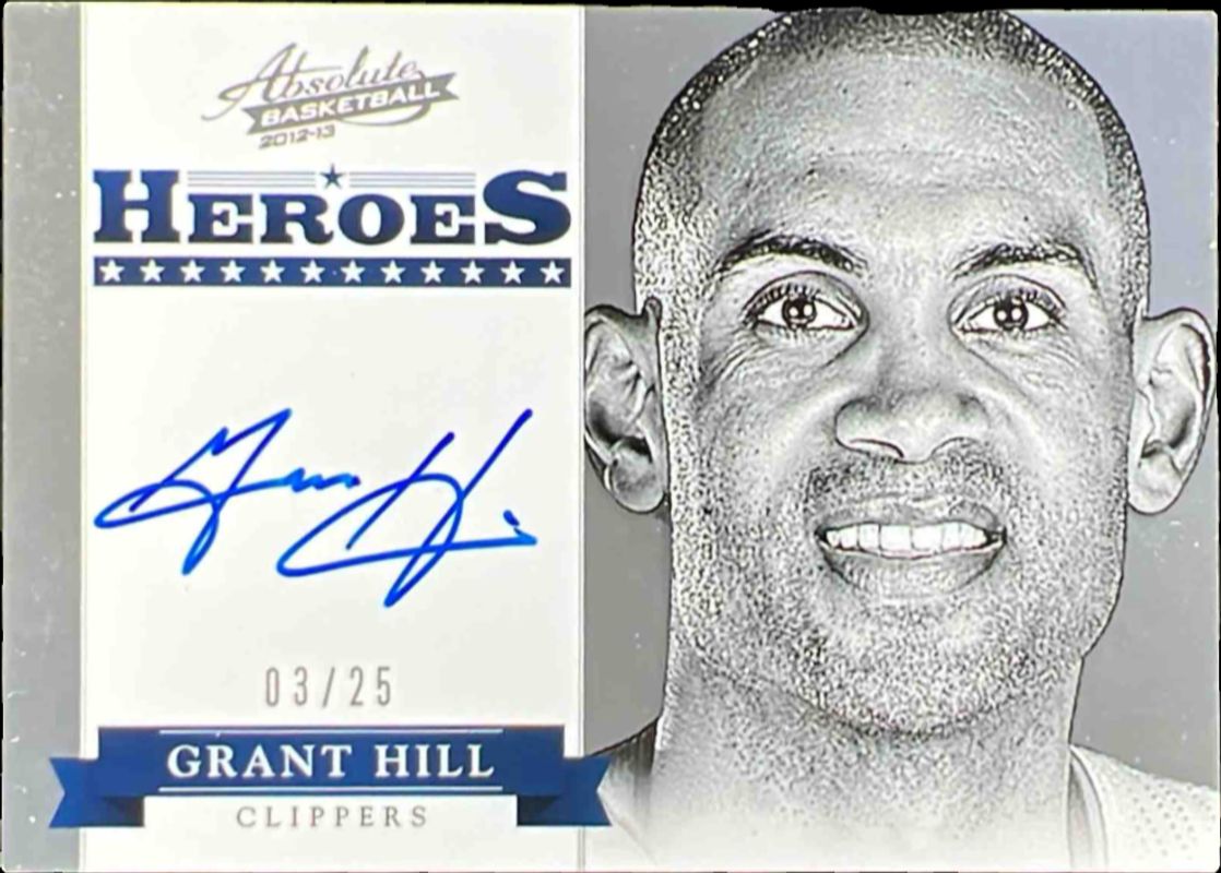 The Grant Hill 2012 Absolute #43 Heroes Autographs /99 card is 1 of 8 Grant Hill's card variations in the 2012 Absolute set being tracked by Sports Card Investor, including Base /399, Spectrum Gold /25, Spectrum Platinum /10, Spectrum Black /1, and Hoopla Autographs /49.