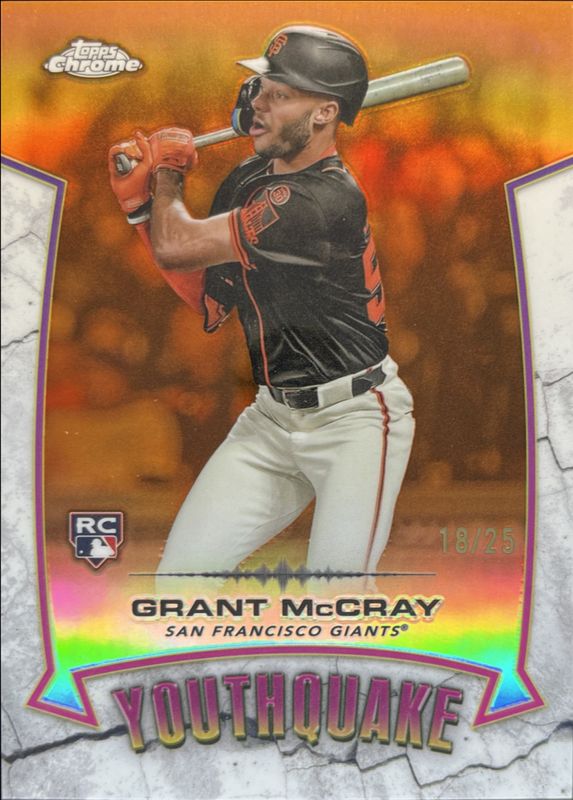 The Grant McCray 2025 Topps Chrome #YQ-17 Youthquake - Orange Refractor /25 Rookie card is 1 of 81 Grant McCray's card variations in the 2025 Topps Chrome set being tracked by Sports Card Investor, including Base, Geometric Refractor, Lightboard Logo Variation, Negative Refractor, and Prism Refractor.