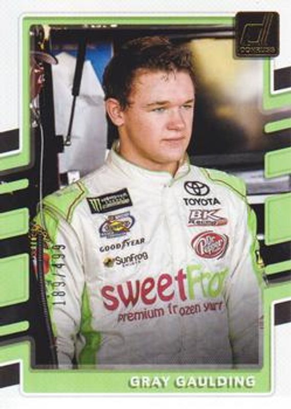 The Gray Gaulding 2018 Donruss NASCAR #64 Gold Foil /499 card is 1 of 17 Gray Gaulding's card variations in the 2018 Donruss NASCAR set being tracked by Sports Card Investor, including Base, Red Foil /299, Green Foil /199, Press Proof Gold /99, and Press Proof Holofoil /49.