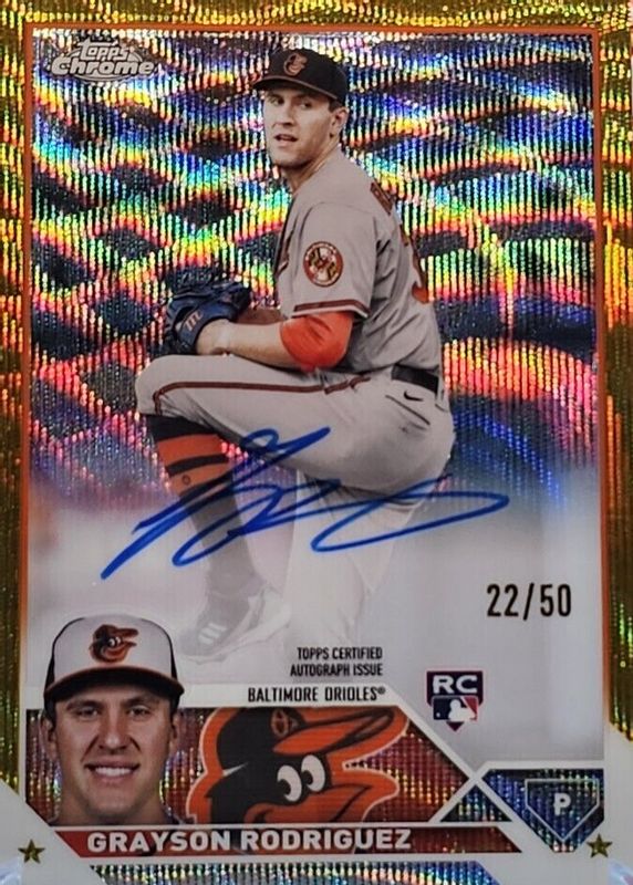The Grayson Rodriguez 2023 Topps Chrome #RA-GR Rookie Autographs - Gold Wave Refractor /50 card in Raw condition has not changed in price in the last 30 days and was last sold for $149.99 .