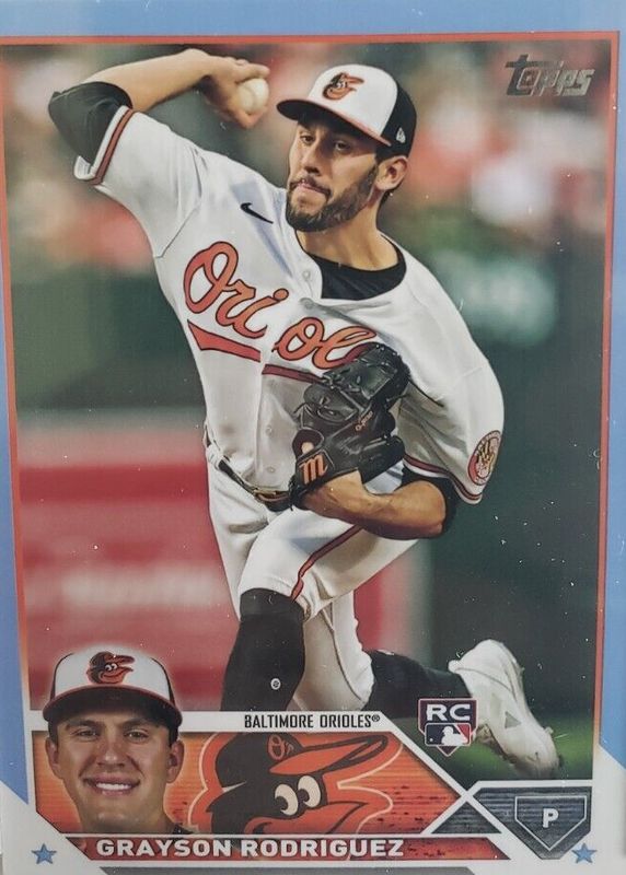The Grayson Rodriguez 2023 Topps Update #US50 Father's Day Powder Blue /50 Rookie card in Raw condition has moved down -$6.67 (-52.6%) in the last 30 days and was last sold for $6.00 .