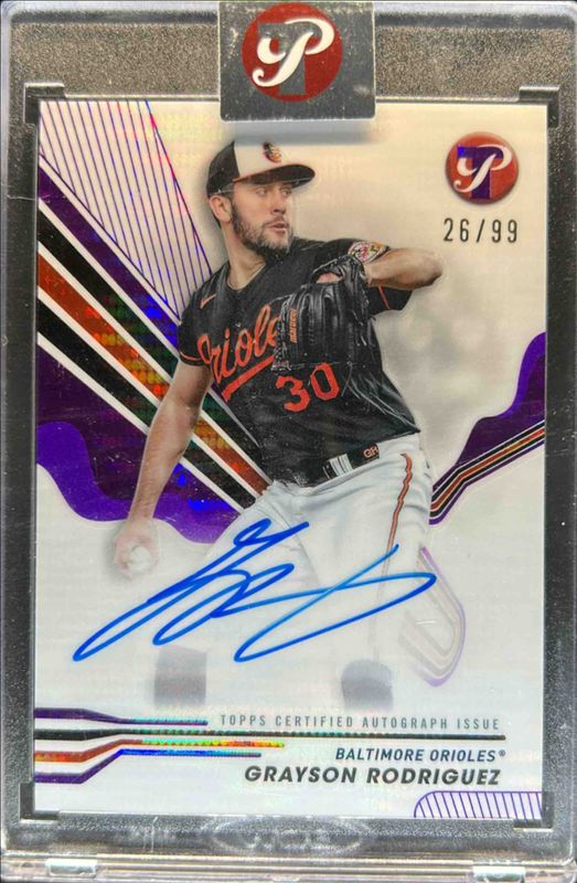 The Grayson Rodriguez 2024 Topps Pristine #PA-GR Pristine Autographs - Purple Pristine Refractor /99 card is 1 of 8 Grayson Rodriguez's card variations in the 2024 Topps Pristine set being tracked by Sports Card Investor, including Pristine Autographs, Pristine Autographs - Green Pristine Refractor /150, Pristine Autographs - Blue Pristine Refractor /75, Pristine Autographs - Gold Pristine Refractor /50, and Pristine Autographs - Orange Pristine Refractor /25.