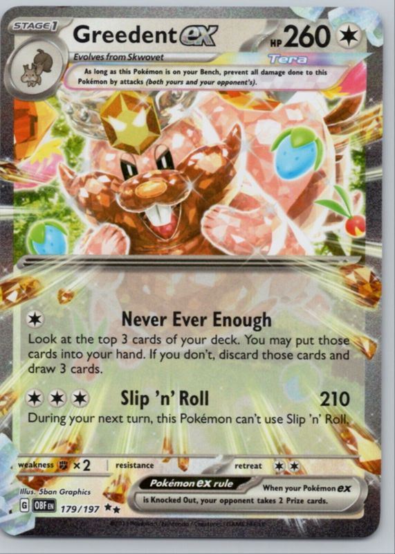 Greedent ex's Pokemon cards are available in at least 1 sets. Greedent ex's biggest 7-day price movers are 2023 Scarlet & Violet: Obsidian Flames #179/197 Double Rare.