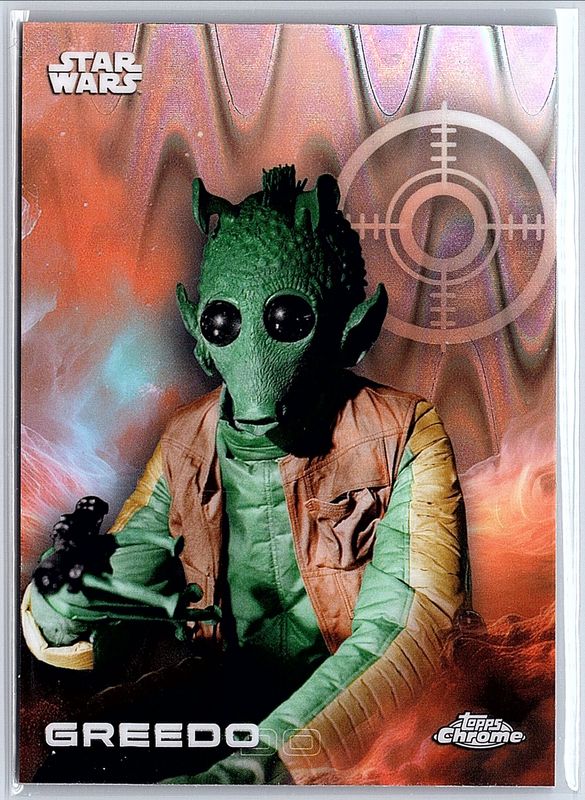The Greedo 2025 Topps Chrome Star Wars #54 Wave Refractor card is 1 of 36 Greedo's card variations in the 2025 Topps Chrome Star Wars set being tracked by Sports Card Investor, including Base, Black & White Shimmer Refractor, Blue Pulsar Refractor, Prism Refractor, and Purple Pulsar Refractor.