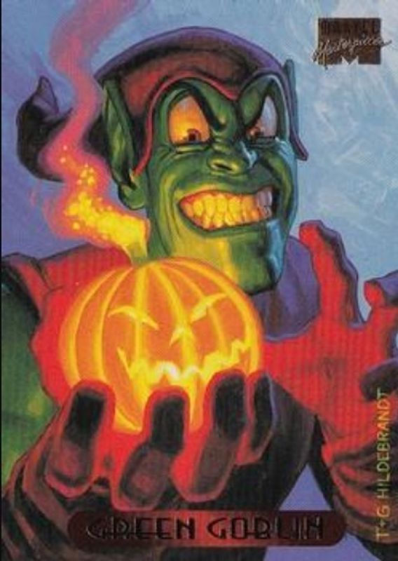 The Green Goblin 1994 Fleer Marvel Masterpieces Hildebrandt Brothers #44 Base card is 1 of 3 Green Goblin's card variations in the 1994 Fleer Marvel Masterpieces Hildebrandt Brothers set being tracked by Sports Card Investor, including Gold Foil Signatures, and 4 Card Panel Promos.