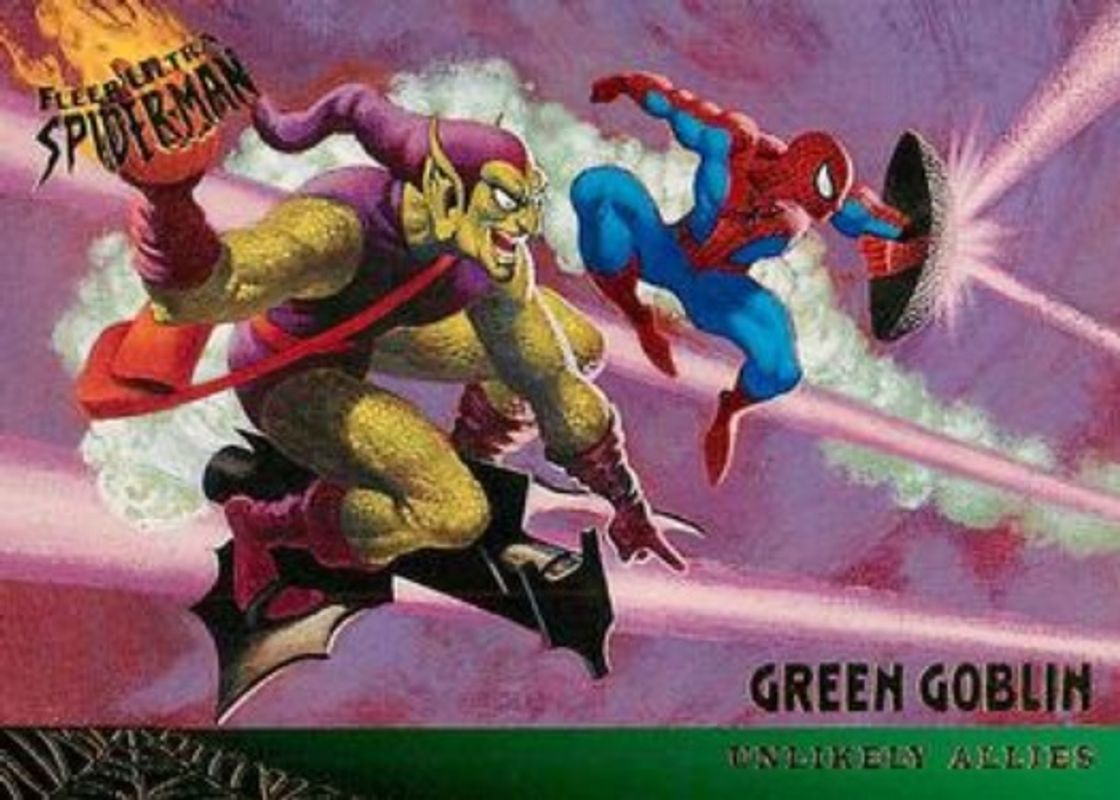 The Green Goblin 1995 Fleer Ultra Spider-Man #129 Base card is 1 of 9 Green Goblin's card variations in the 1995 Fleer Ultra Spider-Man set being tracked by Sports Card Investor, including #23 Base, #79 Base, #80 Base, #80 Gold Foil Signatures Series, and #129 Gold Foil Signatures Series.