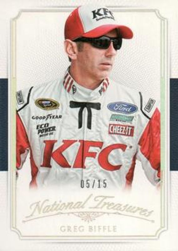 The Greg Biffle 2016 National Treasures NASCAR #12 Century Gold /15 card is 1 of 94 Greg Biffle's card variations in the 2016 National Treasures NASCAR set being tracked by Sports Card Investor, including Base /25, Century Silver /20, Century Black /5, Century Blue /1, and Printing Plates Black /1.