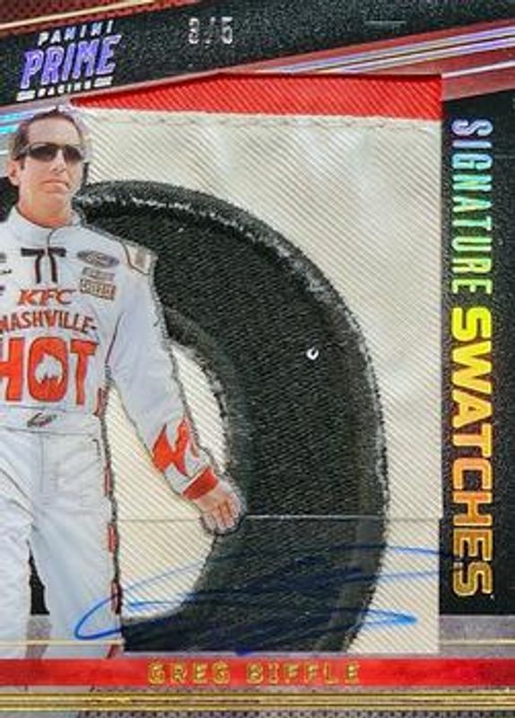 The Greg Biffle 2023 Panini Prime #SSW-BIF Signatures Swatches - Holo Gold /5 card is 1 of 44 Greg Biffle's card variations in the 2023 Panini Prime set being tracked by Sports Card Investor, including Base /49, Holo Gold /25, Holo Silver /10, Purple /5, and Holo Platinum Blue /1.