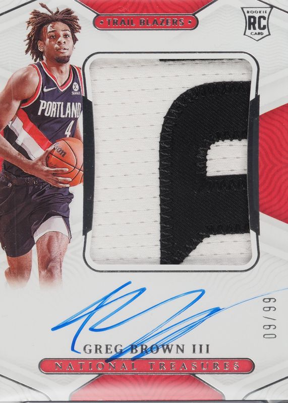 This card is 1 of 10 Greg Brown III's card variations in the 2021 National Treasures set being tracked by Sports Card Investor, including Rookie Patch Auto - Bronze (/49), Rookie Patch Auto - NBA 75th (/75), Rookie Patch Auto - Pink (/25), Rookie Patch Auto - Gold FOTL /24, and Rookie Patch Auto - Gold /10.