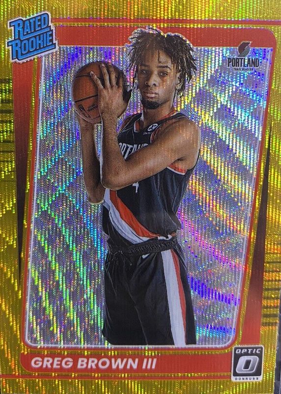 The Greg Brown III 2021 Optic #195 Gold Wave Rookie card in Raw condition has not changed in price in the last 30 days and was last sold for $0.99 .