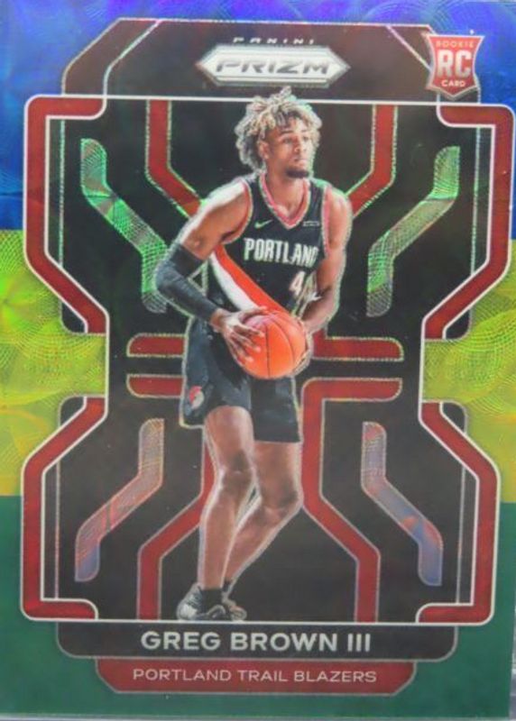 The Greg Brown III 2021 Prizm #291 Choice Blue Yellow Green Rookie card in Raw condition has not changed in price in the last 30 days and was last sold for $2.50 .
