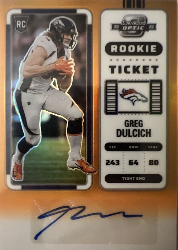 The Greg Dulcich 2022 Contenders Optic #166 Rookie Ticket Auto - Orange /50 card in Raw condition has not changed in price in the last 30 days and was last sold for $2.25 .