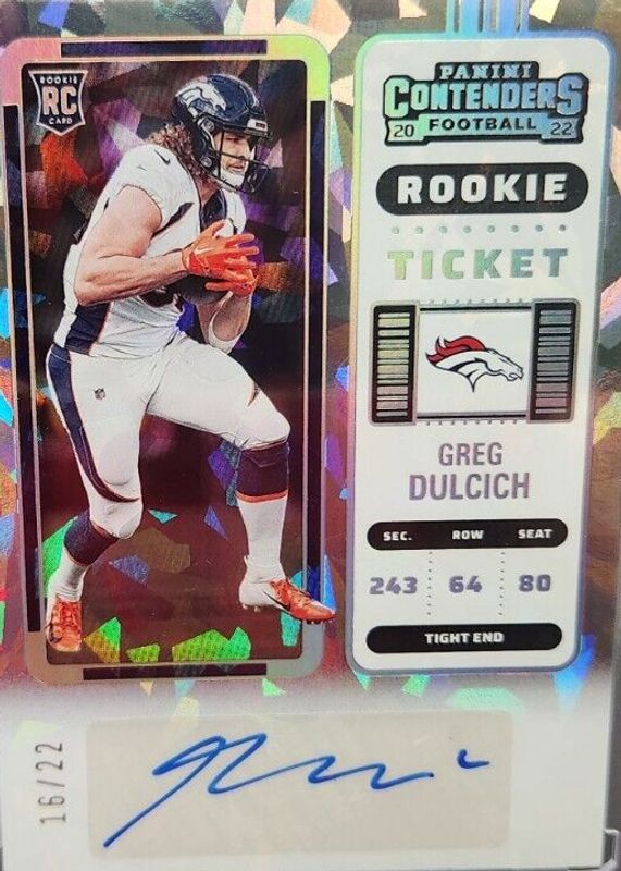 2022 Panini Contenders GREG DULCICH Rookie Ticket Cracked Ice Auto /22 Broncos