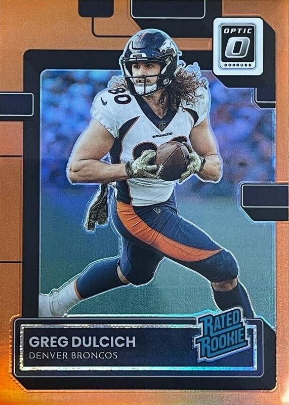 Greg Dulcich 2022 Donruss Optic RC Orange Prizm Rated Rookie #/199 Broncos #288