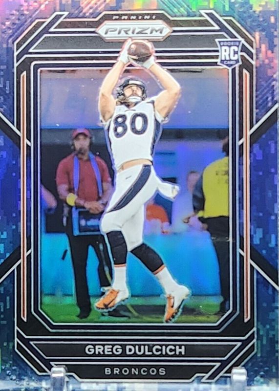 This card is 1 of 67 Greg Dulcich's card variations in the 2022 Prizm set being tracked by Sports Card Investor, including Base, Green, Green Ice, Light Blue, and No Huddle.