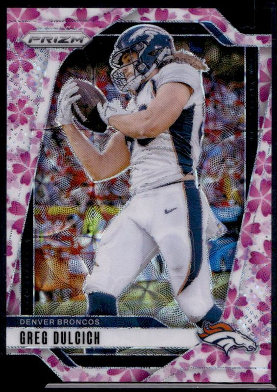The Greg Dulcich 2024 Prizm #85 Choice Cherry Blossom /15 card is 1 of 84 Greg Dulcich's card variations in the 2024 Prizm set being tracked by Sports Card Investor, including Base, Choice Blue Yellow Green, Choice Silver, Disco, and Green.