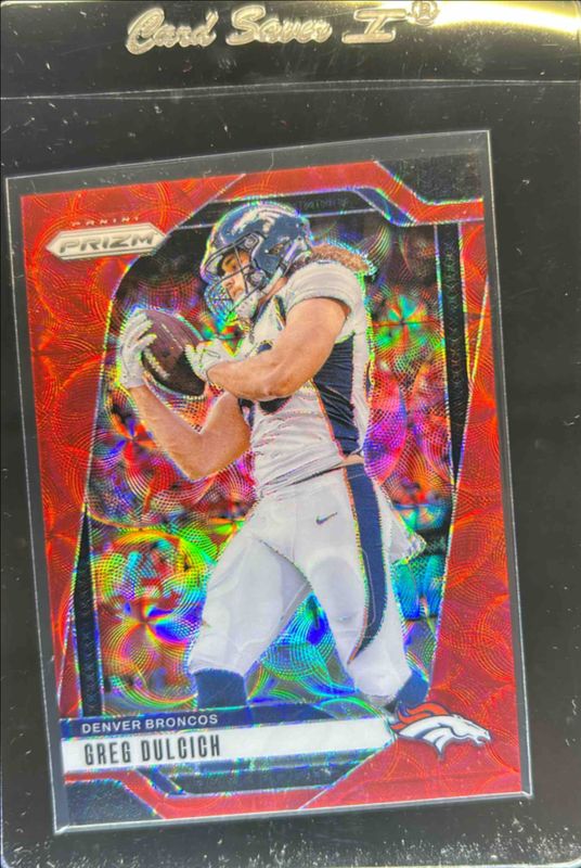 The Greg Dulcich 2024 Prizm #85 Choice Red /20 card is 1 of 84 Greg Dulcich's card variations in the 2024 Prizm set being tracked by Sports Card Investor, including Base, Choice Blue Yellow Green, Choice Silver, Disco, and Green.