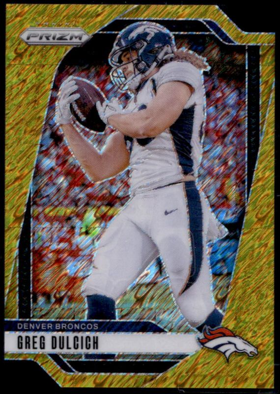 The Greg Dulcich 2024 Prizm #85 Gold Shimmer /10 card is 1 of 84 Greg Dulcich's card variations in the 2024 Prizm set being tracked by Sports Card Investor, including Base, Choice Blue Yellow Green, Choice Silver, Disco, and Green.