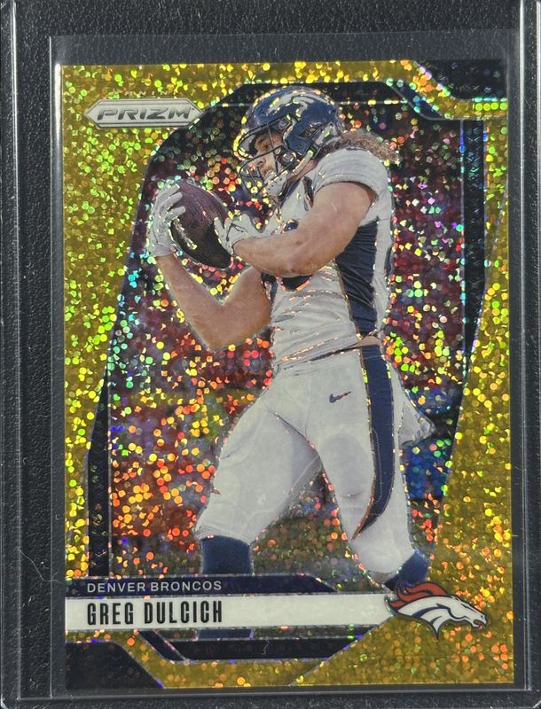 The Greg Dulcich 2024 Prizm #85 Gold Sparkle /24 card is 1 of 84 Greg Dulcich's card variations in the 2024 Prizm set being tracked by Sports Card Investor, including Base, Choice Blue Yellow Green, Choice Silver, Disco, and Green.